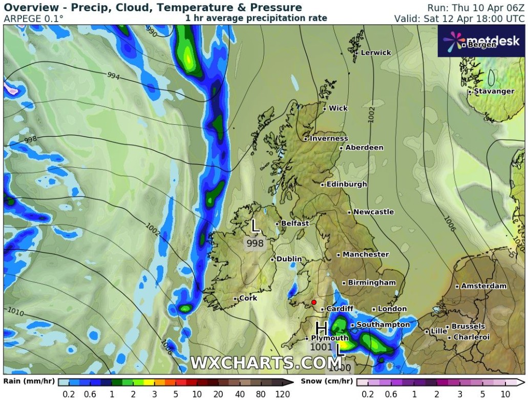 The north-south precipitation band seems more certain in position, though it has been pushed west and unlikely to affect the mountain forecast during the daylight hours. But what about that amebous feature in the southwest? Nearly gone! Only the ARPEGE model pushes it near Wales, and just barely. With such major changes between days and still disagreement between models, while we do warn of the possibility of precipitation in the west, it is appropriate to warn the reader that it is a low confidence forecast.