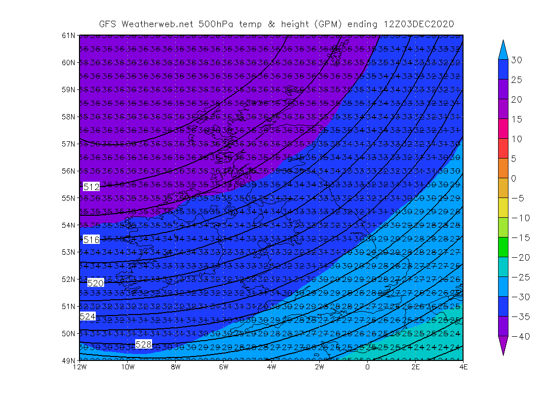 Almost imperceptible on a standard synoptic chart, lurking among a melee of isobars, there are some dotted lines too. You'll have to look closely to find a '528' marker! I've highlighted this line in blue. Maybe easier to spot is a line with a '546' label visible, which lies over the mid-Atlantic. Above is the forecast chart for this Thursday, which is when the 528 line makes an appearance across our shores.